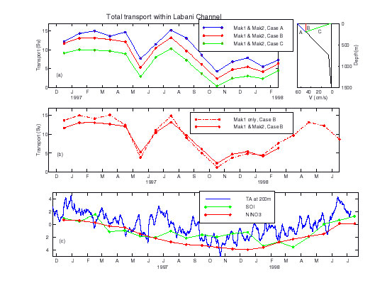 Fig. 4 Total southward or throughflow transport within Makassar Strait (displayed as positive values) for each month (Fig. 4a,b). As the data from the moored ADCP (deployed at 150 m) is still being processed (see text) we use three models for carrying the Aanderaa along channel speeds to the sea surface (insert adjacent to 4a). As mentioned in the text, we favor Case B, which on average differs from A and C results by 2.4 Sv, about 25% difference. Transport determined from use of both moorings for the period up to February 1998, agrees closely with the use of only MAK-1 (4b), suggesting that one mooring may be sufficient in monitoring Makassar transport. The temperature recorded by the 200 m instrument of MAK-1 was processes to remove the mean vertical temperature gradient, recorded during the strong semi-diurnal blowover movements. An anomaly of temperature was then calculated, the difference between the temperature change expected from the mean temperature profile from that actually recorded. The temperature anomaly (Fig. 4c) compares favorable to the ENSO indicators of SOI and the SST anomaly at El Niño-3. The thermocline is deeper during La Niña, shallower during El Niño, as also shown in Figure 2; thermocline depth is correlated with transport magnitude.
