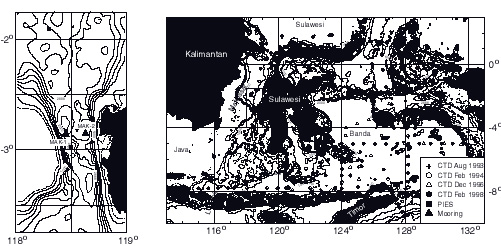 Figure 1. Distribution of CTD stations and time series moorings obtained by the Arlindo program. The position of the current meter and temperature-pressure pod moorings in Makassar Strait, MAK-1 (2° 52' S, 118°27' E) and MAK-2 (2°51'S; 118°38'E) the subject of this note, are shown in the insert, as are the Pressure, Inverted Echo Sounder sensors (PIES).